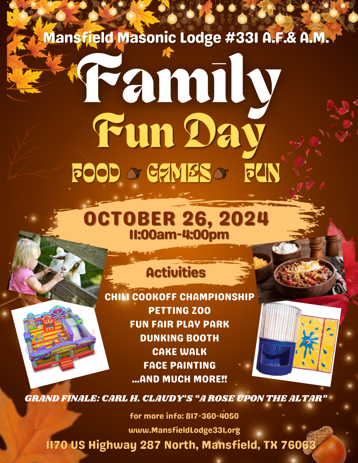 Activites incude a Chili Cookoff Championship, Petting Zoo, Fun Fair Play Park, Dunking Booth, Cake Walk, Face Painting, and much more!